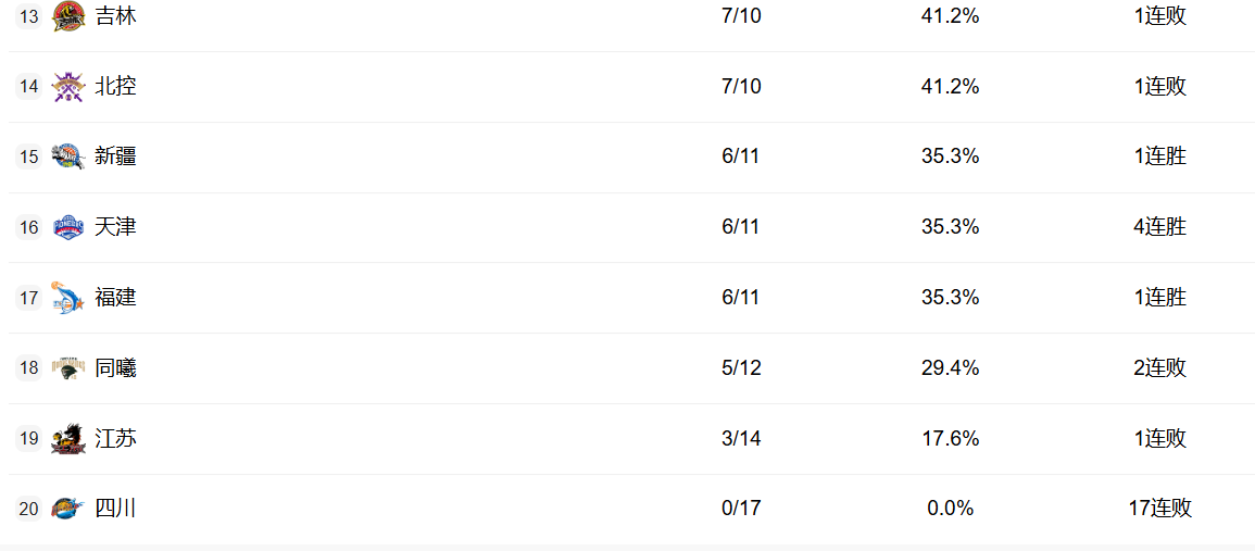 江苏最近崛起,但这轮输球之后停滞。四川已经17连败了。