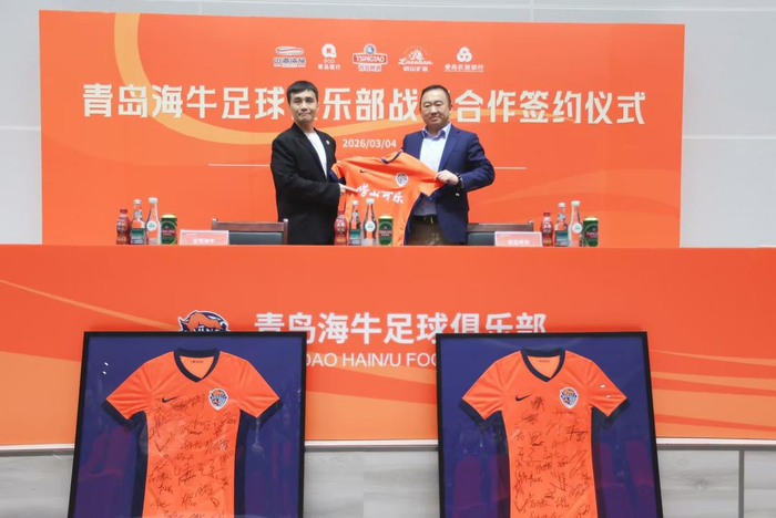 2026赛季,青岛海牛足球俱乐部将携手青岛本土品牌青岛啤酒、青岛饮料集团、青岛银行、青岛农商银行一同为这座城市的荣誉而战,出征仪式中,俱乐部与该4大品牌进行了签约仪式,携手向前。活动期间,新赛季球衣由部分球员展示,胸前广告“崂山可乐”首次亮相。