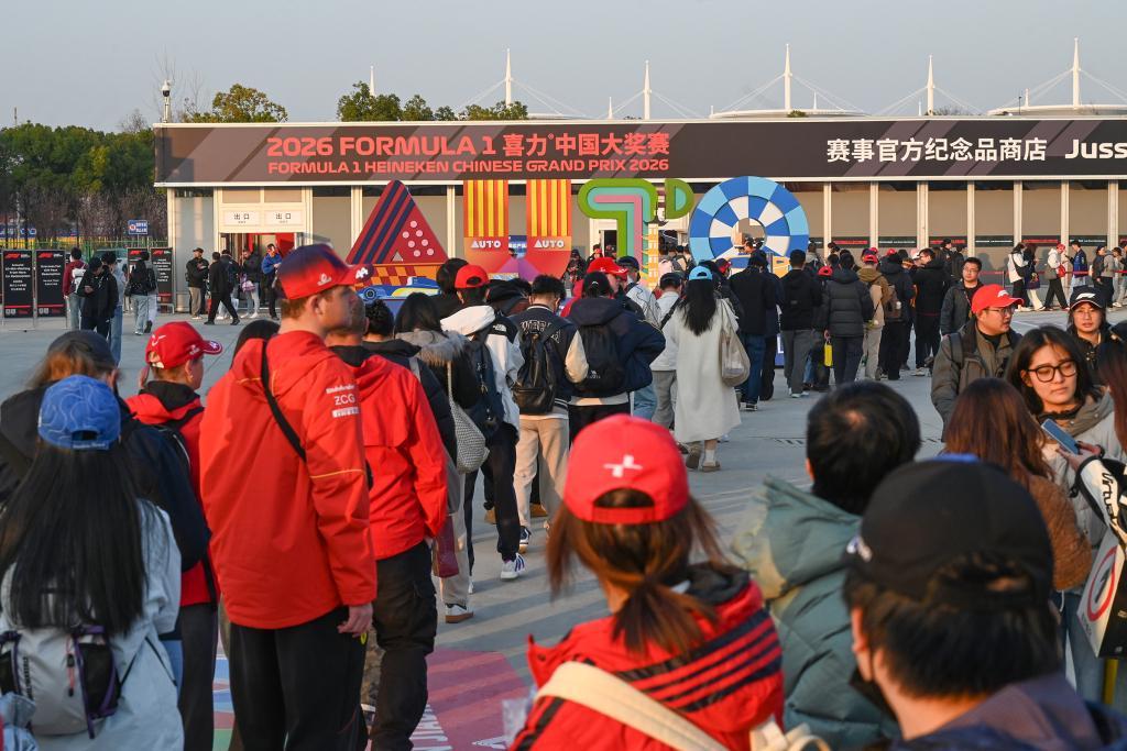 2026年3月13日,周五首日F1冲刺排位赛结束后已近黄昏,车迷们在设立于赛场外的官方纪念品商店前排起长队。